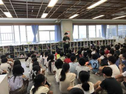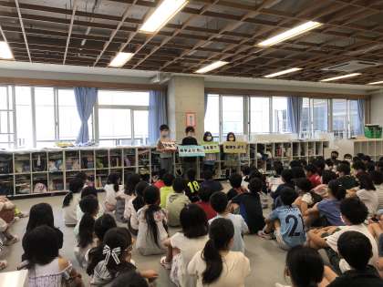 4年生は、学年朝会であいさつ宣言とあいさつ運動についての話をしました。