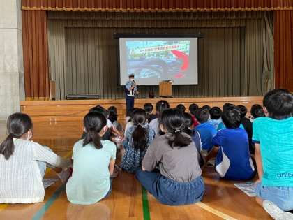 体育館では、DVDを見ながら自転車の安全な乗り方について学びました。