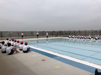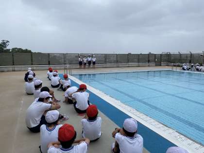 あいにくの天候だったり、水温と気温が足りなかったりと、実際にプールには入れませんでしたが、水泳学習での約束等をプールサイドで確認しました。