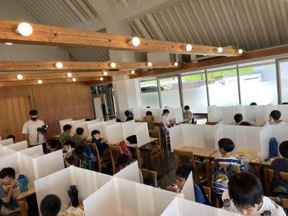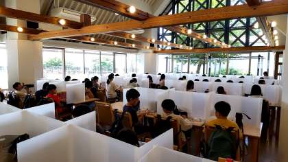 感染症対策としてパーテーションで仕切られている中での食事となっています。