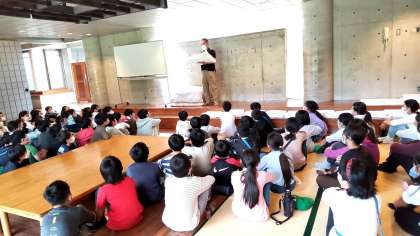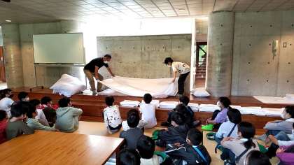 ハイキングの後、宿舎に戻り枕やシーツなど、布団の準備についてレクチャーを受けています。