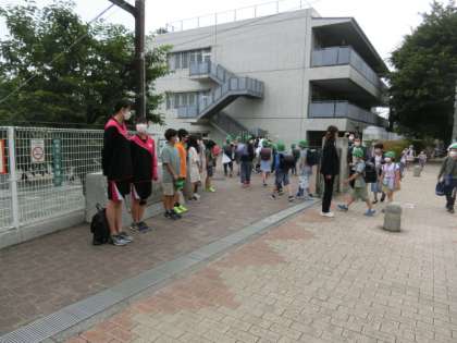 桜丘小学校の正門と西門に桜丘中学校の生徒と本校の児童が一緒になり、