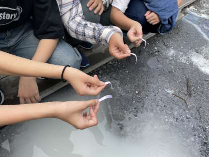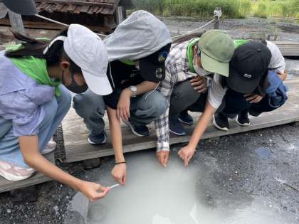 源泉に向かっている途中、「温泉玉子のにおいだ!」と、硫黄の香りに驚いていました。