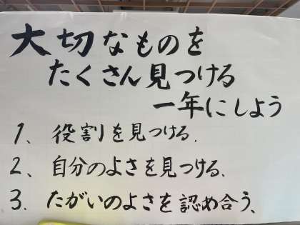 次に、学年のテーマである「大切なものをたくさん見つける一年にしよう」についてお話をしました。役割を見つける、自分のよさを見つける、互いの良さを見つける、ということを大切にしてきました。