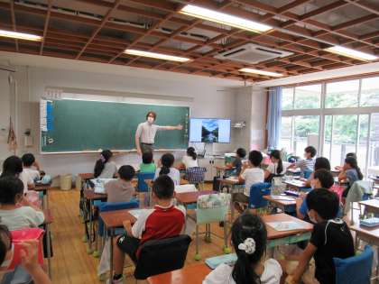 先週から4年生は外国語活動の授業が始まりました。久しぶりに英語に触れる子どももいましたが、ALTの夏休みの思い出を一生懸命聞き取ろうとしたり、夏休みの思い出に関する写真を見て楽しそうにリアクションしたりしていました。