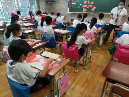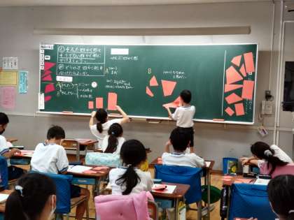 「角が、全部直角をのものを集めました」「辺がななめになっていないものを集めました」など、辺や角に注目して分類することができました。自ら、考え伝え合う子どもたち 友達の考えをじっくりと聞いていました。