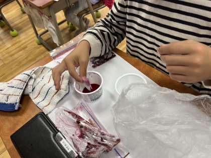 1年生は、「さかせたいな、わたしのはな」の学習のまとめとして、あさがおの色水遊びを行いました。