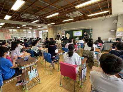 大学生3名が授業をしてくださり、今の生活をし続けるとどうなるか、という100年後の天気予報の動画や、昔と今の暮らしの比較などをしながら、エネルギーについて考えました。