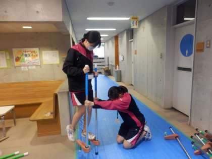 本校保護者OGの「もったいない屋さん」からご寄付いただいた竹馬を組み立ててくれました。子どもたちが安全に使えるように試し乗りもしてくれました。