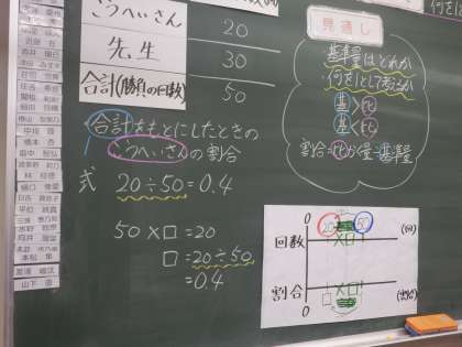 割合が0.66…や1.5になる場合の比較量と基準量を考える学習では、様々な組み合わせを試行錯誤しながら求めることができました。