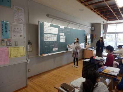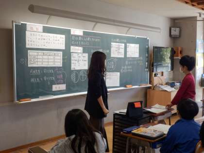 「単位量当たりの大きさ」の学習を生かして1回あたりの入る回数を出したり、公倍数を使った考えを出したりと多様な考えを見比べることで、割合について理解しました。