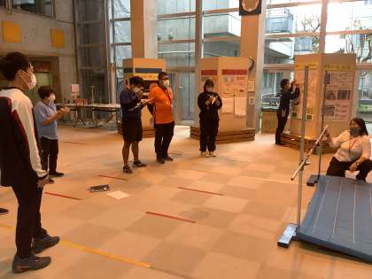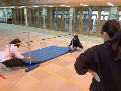 本日、あつまれ広場で、高跳びの授業を想定した、体育研修を行いました。準備の際、マットの位置や高跳び用バーをどのように設置するか教職員同士で確認しました。高跳びは短い助走から強く踏み切って高く跳ぶ、楽しい運動です。高跳び用バーをゴム紐にすることで恐怖心を和らげたり、高さを容易に調節したりしました。また、ラインを最初に引いて助走の向きを伝えることで、スムーズな学習展開になることを学びました。安全指導や跳ぶコツ、予想されるつまづきをみんなで考え合うことができました