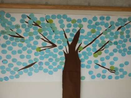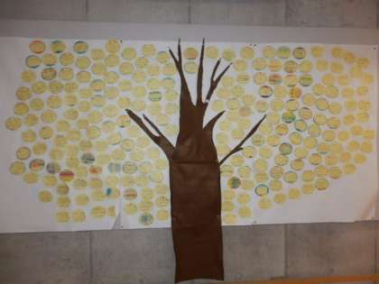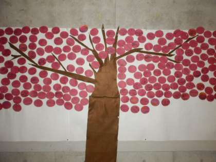 友だちのよさを見付け伝え合う「エールの木」にエールの言葉がたくさん実っています。
