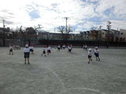 真ん中の的に向けて投げる子と中で的を守る子で対戦です。