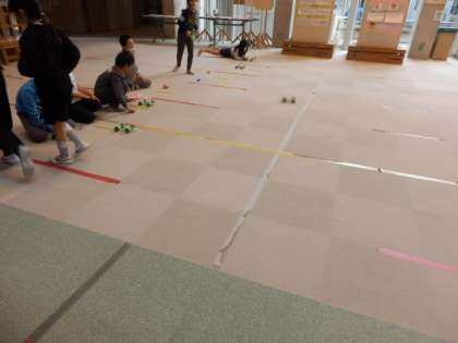 集まれ広場では、3年生が理科の学習でゴムのはたらきを使って、車を走らせていました。ゴムの伸びによって速さや、距離が違うことに気付いていました。