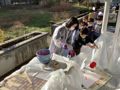 花の子作品展に向けて、本日は2・3・5組が平面作品「イロドリ」の授業を行いました。1・4組は、昨日行いました。画用紙に、赤、緑、紫、水色から一色を選び、絵の具を含ませたスポンジを落として鳥の体を表現します。「きれいな色で、うれしい。」「スポンジを上から落とすのが、面白かった。」と、楽しみながら取り組むことができました。