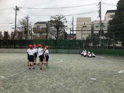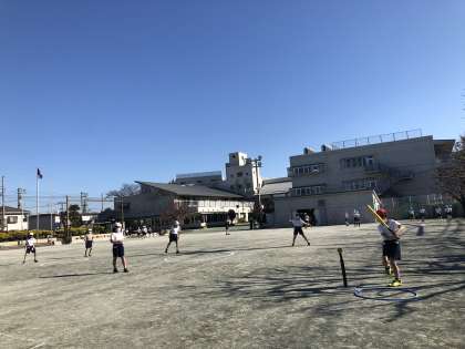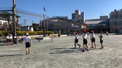 4年生の体育では、校庭で「Tボール」をしています。野球が得意な子や、あまりバットを使ったことがない子などそれぞれですが、全体でルールを確認しながら試合を進めています。