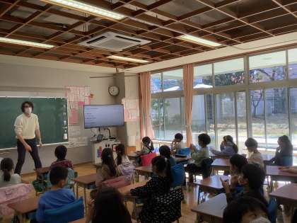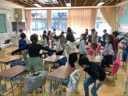 本日、4時間目に英語の授業がありました。ALTの先生に、「動作」の発音の仕方を教えていただきました。子ども達は、「読む」は、「read」と言うことを、「初めて知った。」と目を輝かせて、生き生きと発音できました。慣れたところで、ジェスチャーゲームをしました。英単語に合わせて、歩いたり、ジャンプしたり、様々な動作を楽しみながらすることができました。