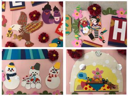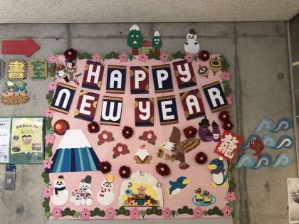 1/10 お正月の壁面装飾 図書室壁ボランティアの方々作成