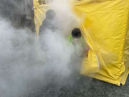 子どもたちは3つのポイントを実践しながら、煙のトンネルをくぐり抜けました。体験後には、「全然前が見えなくて困った」「実際の煙は黒いから、もっと大変なんだな」と、煙を吸うことや近づくことの危険性を学びました。