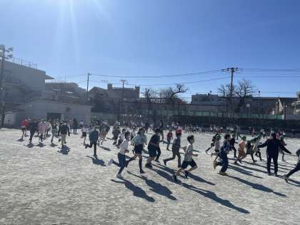 毎日寒い日が続いています。本日、青空の下で体力つくりが行われました。音楽に合わせて、3分間持久走をしました。スタートからいきなりダッシュするのではなく、自分のペースで走り続けることを目標に一生懸命に走りました。教室に戻ってくると、「次こそはもう1周多く走れるように頑張る!」という声も聞こえてきました。