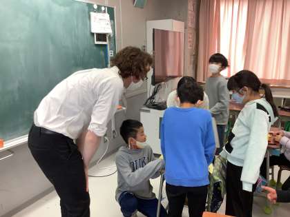 「すごいね。おいしそうだ。」と先生が英語で話すと、つかさず子供達が「うまくできたんだよ。」と返し、先生が「おなか減っちゃうなぁ。」と微笑ましい会話をしていました。
