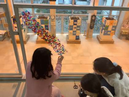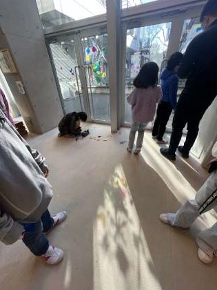 セロファンを重ねたり、並べたり、何かイメージをもってつくったり。時間帯により窓に太陽の光が当たりカラフルな影ができます。あつまれ広場の大きな窓や2階の廊下のガラスのところにありますので、ぜひご覧ください。