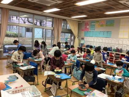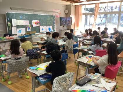 本日、放課後に子ども達作品を展示しました。1年生は、「イロドリ」と「バースデーケーキ」の2作品中から、1つを選び、展示しています。「イロドリ」の見どころは、クレヨンを使い、色鮮やかに仕上げた羽です。「バースデーケーキ」の見どころは、子ども達の発想力で、ケーキの色や飾りを工夫して、個性豊かな作品に仕上がっています。ぜひ、子ども達のすてきな作品をご鑑賞ください。