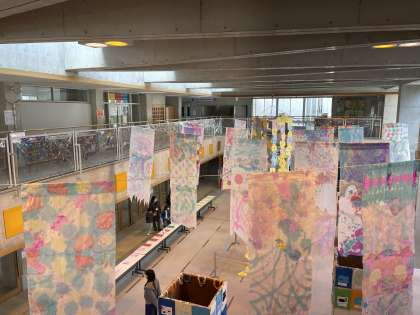 それぞれの学年のフロア、集まれ広場等を活用して作品を展示しております。