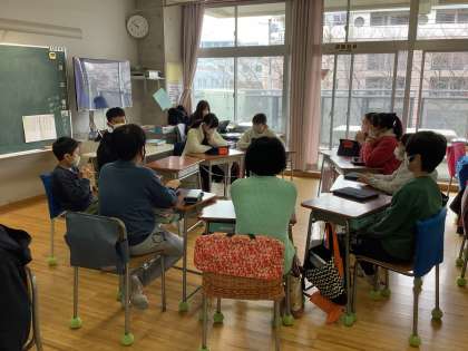 5年生は学年末の活動として、英語を使って他クラスと交流を行いました。どのクラスも2回、他クラスと交流する機会がありました。最初は緊張した様子や思うように話せなかったり、リアクションの取り方に戸惑ったりしている子もいましたが、2回目は1回目よりもスムーズに会話ができている子が多く見られました。英語を使って楽しく会話をするという経験を通して、英語を使うことへの自信につなげられたら、と思います。