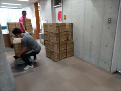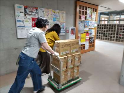 本日、PTA本部の役員の皆様が、来週子どもたちに配布する備蓄水を各学年のフロアに運んでくださいました。