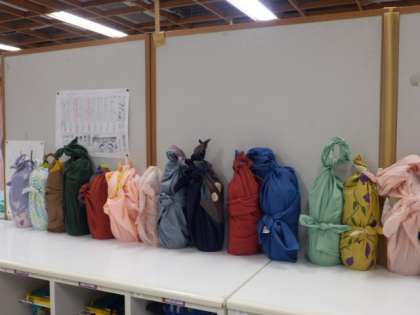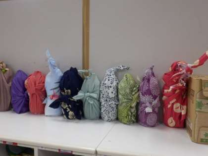 3年生のフロアに行くと、様々な色の風呂敷で包んだものがありました。
