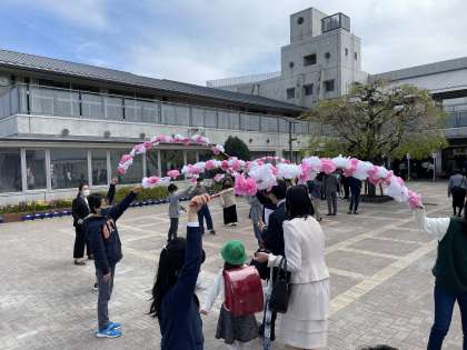 6年生が準備した花のアーチを通って、笑顔いっぱいの1年生が登校しました。