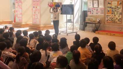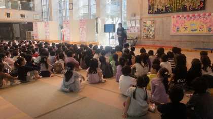 4月14日(金)、1年生は初めての学年朝会をあつまれ広場で行いました。学年の先生の紹介、学校の約束についての話がありました。先生たちは、「好きな〇〇」というお題で自己紹介をしました。子どもたちも楽しみながら、先生の名前を覚えることができました。学校の約束では、登下校の歩き方、校舎内外の過ごし方、靴箱の使い方について話をしました。早速、子どもたちが、生活に気を付けて過ごす姿が見られました。