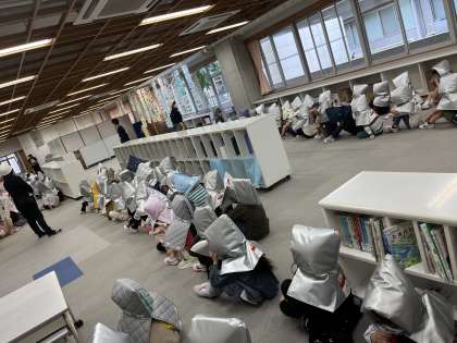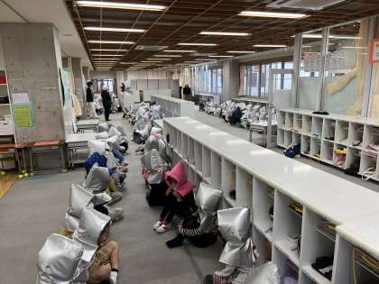 まず、全校で大地震を想定した避難訓練を行いました。「お・か・し・も」の約束を守り、素早く避難ができていました。