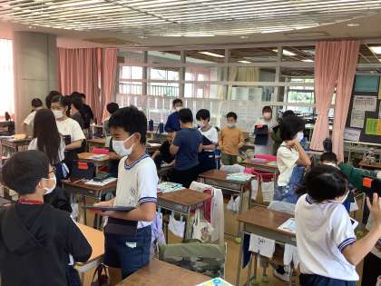 6年生はUnit1で新しく習った出身地や得意なことを表す英語、“I’m from~.”や“I’m good at~.”を使って友達と「なりきり自己紹介」をしました。自分自身の自己紹介をすることにはもう慣れているので、今回は子どもたち自身が考えた架空の人物になりきって自己紹介を行いました。これまでとは違って相手の回答が予想できないことや他の人物になれるという新しい活動に子どもたちはとても意欲的に取り組んでいました。今後も学習した表現を用いて子どもたちが楽しく活動に取り組めるような授業にしていきます。