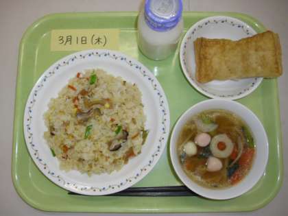 今日の給食は、ちらしずし・牛乳・あんかけ汁・お楽しみデザートです。