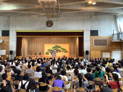 話の内容は知っていても、実際に生で狂言を鑑賞するのは初めてという子が多く、みんな興味津々でした。話が進むにつれて、狂言の世界観にどんどん引き込まれ、体育館が大きな笑い声で包まれました。