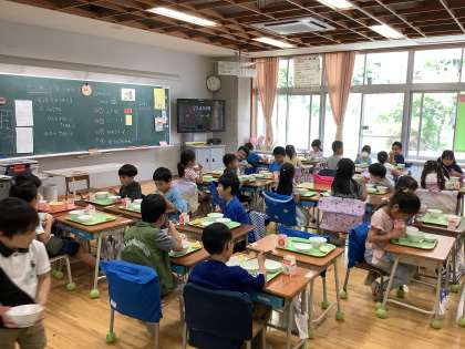 6月より、全学年グループの形で給食を食べています。コロナ前の通常の形に戻りました。友達と楽しい会話をしながら笑顔で食べています。加えて、放送委員会や給食委員会の高学年の児童がお昼の時間に校内放送を担当しています。その間は放送を聞きながら、給食を味わって食べています。児童がとても楽しみにしている時間です。