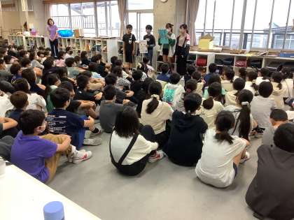 まず最初に、今月の目標を確認しました。(1)6月の生活目標「姿勢よくいすに座ろう」と、(2)「人格の完成を目指して」の目標「責任」が伝えられました。「背中を椅子の背もたれに付けずに、姿勢を正しくしたい。」、「下級生を引っ張っていけるように、責任を持って行動したい。」と、朝会実行委員の人から話がありました。