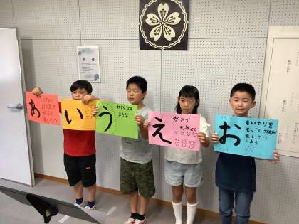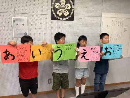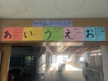 今日の全校朝会で、4年生は挨拶宣言をしました。運動会前から各クラスでどんなものが良いかを考えました。その後、持ち寄った4つの案を各クラスの実行委員でさらに内容を精査し、「あいさつあいうえお」と決めました。