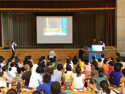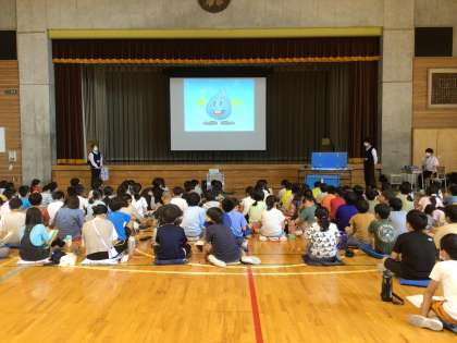 家に水道水が届くまでに必要な場所や工程、働いている人の話や施設の中の動画や写真などを用いながら水の旅と題して、分かりやすく楽しく教えてくれました。また、浄水場で行われている沈殿→高度浄水処理→ろ過→塩素消毒をどうやって行っているのか実験をしてくださり、見ることもできました。子どもたちは話を聞きながら、国語で学習をしたメモの取り方を実践しながら楽しみました。今日、学習したことを社会の時間でまとめていきたいと思います。