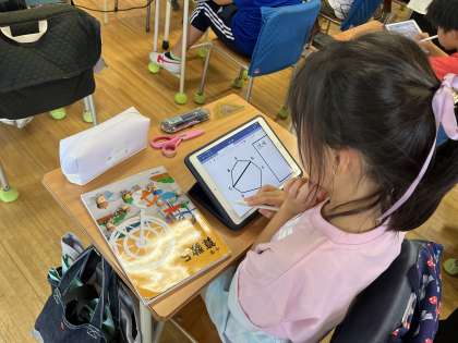 今日の算数は、「合同と三角形、四角形」の単元でした。七角形の内角の和を様々な求め方で考え、友達と共有したり意欲的に発表したりする姿が見られました。七角形だけでなく、他の多角形にも汎用的に使える求め方があるか検討し、考えを深めることができました。