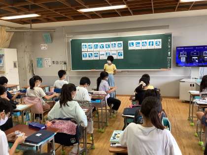 6年生は今オリンピックとパラリンピックに関するスポーツの表現を学習しています。今日は子どもたちが主体になってラッキーワードゲームを行いました。1回教師が見本を見せた後、児童が教師役を行い、児童主体でゲームを進めることができました。次回以降は自分が見たいスポーツについて伝え合う練習をする予定です。