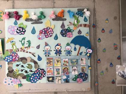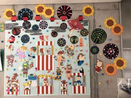 7/8(土)の子どもまつりに合わせて、壁面装飾が「梅雨」から「夏祭り」バージョンに変更されました。
