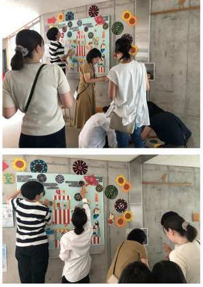 3枚目・夏祭りの壁面装飾完成です。花火や浴衣の模様まで、細かく再現されています。いかやきやわたあめ、たこ焼きの屋台など、見ているだけで楽しくなります。夏祭りの壁面装飾を見た子どもたちは、「夏祭り楽しみー!」とワクワクした気持ちになっていました。