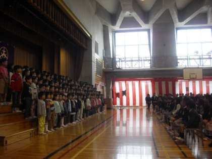 6年生や保護者が見守る中、1年生が拍手で迎えられて入場しました。