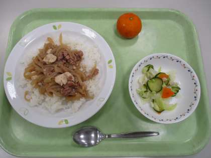 【今日の献立】 ・豚丼 ・野菜の甘酢あえ ・冷凍みかん ・牛乳