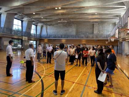 世田谷警察の方に来ていただき、校内に不審な人が来た場合の教職員の対応について、道具を用いながら実際に動きを確認しました。教室や児童に近づけさせないために、さすまたや催涙スプレーなどを用いることや、教職員自身も一定の距離を保ちながら対応することなどを、丁寧にご指導いただきました。
