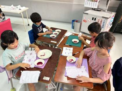 9/13(水)・9/14(木)に、生活の「さかせたいな わたしのはな」の学習で、朝顔の色染めを行いました。子どもたちは、夏休み中に大切に育てた朝顔の花を凍らせて保管していました。それを使って色水を作り、和紙に付けて、思い思いの模様に色染めすることができました。色染めした和紙は、朝顔の観察カードの表紙に使う予定です。これまでのご家庭での朝顔の世話や色染めの準備など、ご協力いただきありがとうございました。